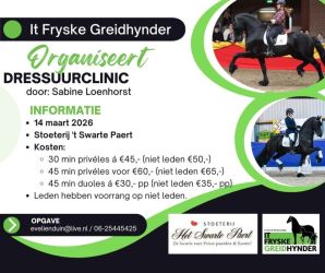 Op zaterdag 14 maart organiseren wij een dressuur clinic met Sabine Loenhorst bij Stoeterij het…